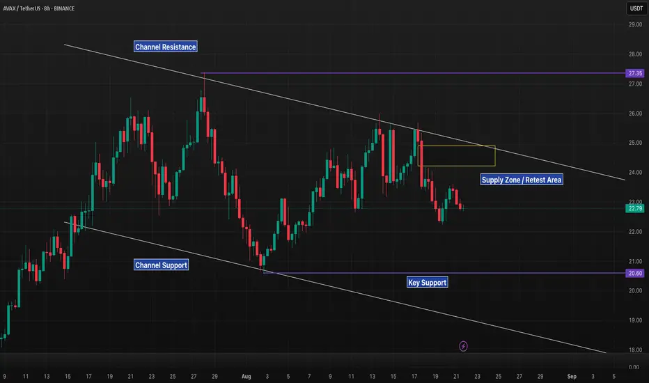 Avalanche continues to trade inside a descending channel, with the most recent bounce failing at the 24–25 supply zone.