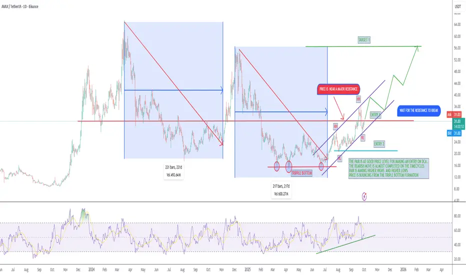 The pair AVAX/USDT seems to be in a bullish run as the price is bouncing from the Triple Bottom formation and making new HH's and HL's and respecting the trend lines.