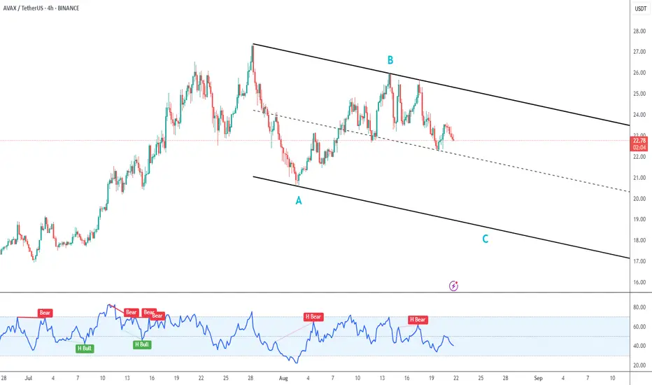 Trend structure: Price is moving within a descending channel, forming an A–B–C corrective structure.