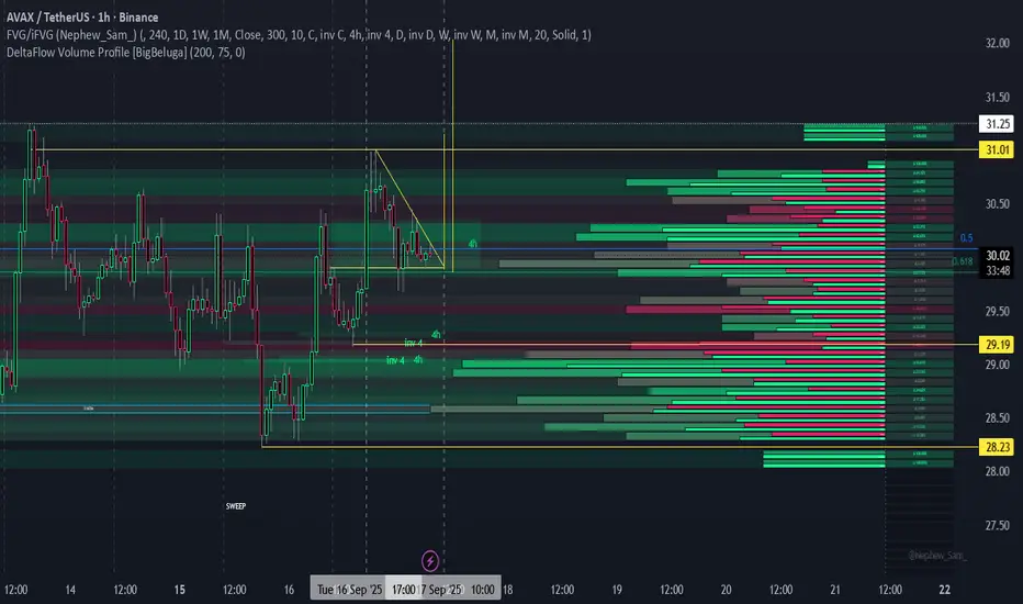 AVAX is printing a classic cup & handle structure on the 1H. The “cup” is formed by the rounded bottom near $27–28, while the “handle” is tightening just below the $30 HVN shelf.