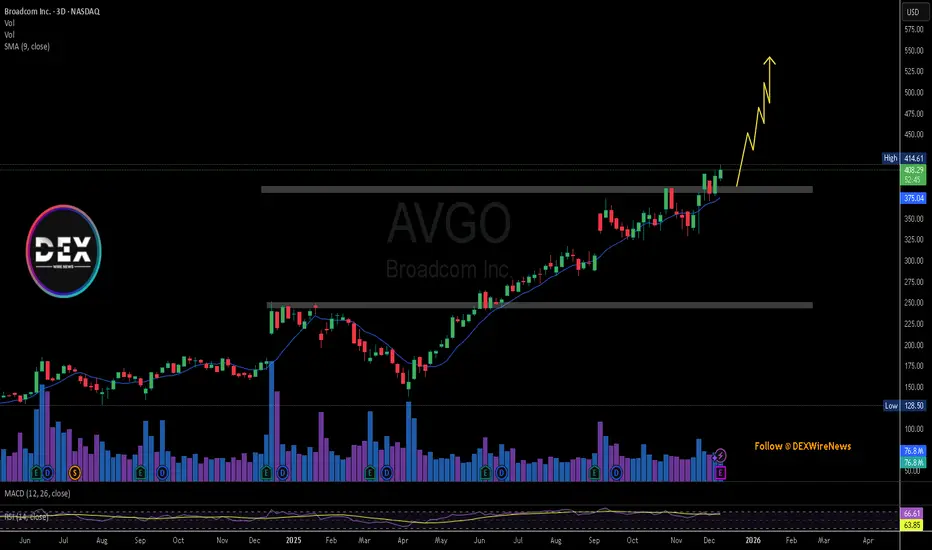 On the chart, AVGO recently broke above a major multi-month resistance zone around $385, flipping it into support. The price is trending above the 9-period SMA, showing strong momentum. A sustained hold above $400 opens the path toward the next psychological zone around $450–$500, where the next round of profit-taking may occur.