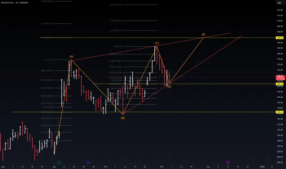 AVGO has completed an A–B–C–D corrective cycle, stabilizing near the 0.618 retracement ($357–358 zone) — a historically strong reversal pocket.