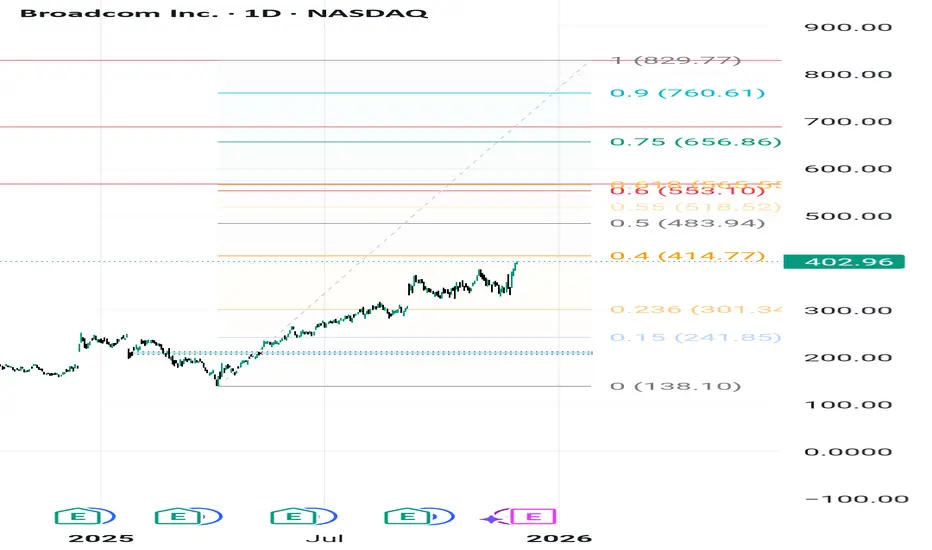 Broadcom Inc. (AVGO) exhibits a strong underlying bullish trend, fundamentally driven by demand for its AI chips and the successful integration of VMware. The technical objective targets a final high of $829.77. However, the path requires breaking through significant resistance levels defined by the Fibonacci structure. The current price is \mathbf{\$402.96}, maintaining the bullish momentum.