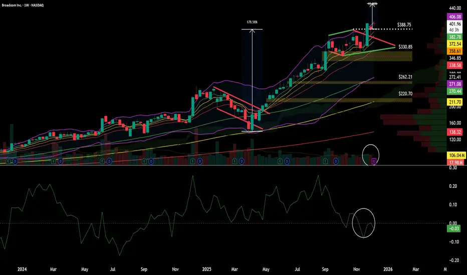 AVGO has displayed classic institutional trend behavior — persistent EMA support, shallow pullbacks, and clean continuation structures.