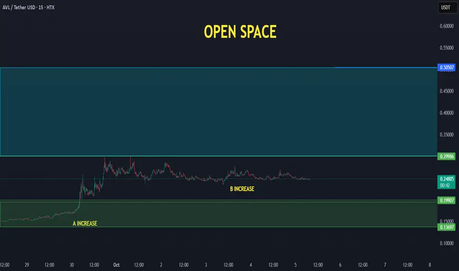 AVL/USDT continues to build strength after confirming its B increase phase, holding firm around the $0.24 – $0.26 range. This consolidation is happening just below a large open space zone, suggesting that a strong move could follow once momentum returns.