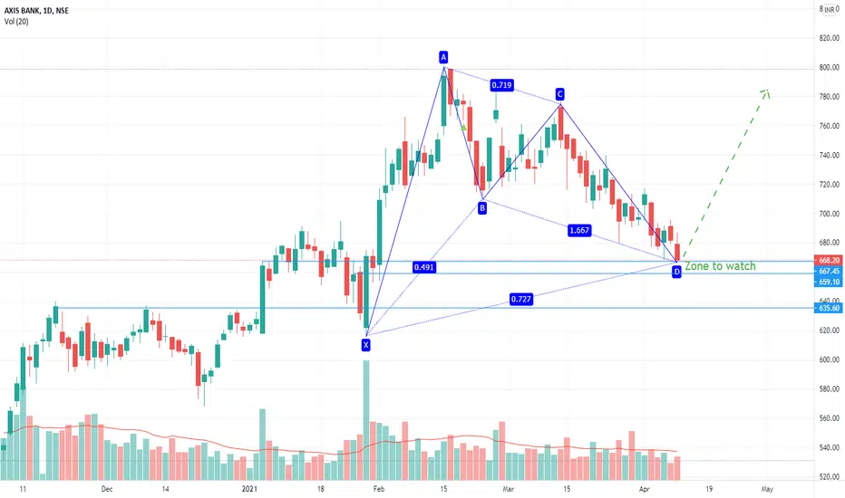 AXISBANK formed bullish Gartley pattern. Watchout price at 668 to 659 . If price not stabilized at this level, it can droop to 635. Watchout and go long!