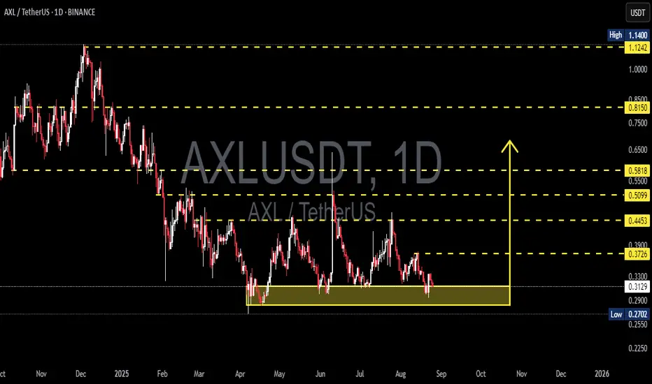 Currently, AXLUSDT (1D, Binance) is trading inside a key demand zone between 0.27–0.33 (yellow box on the chart). This area has been tested multiple times since April 2025, showing strong buying interest whenever price dips into it.