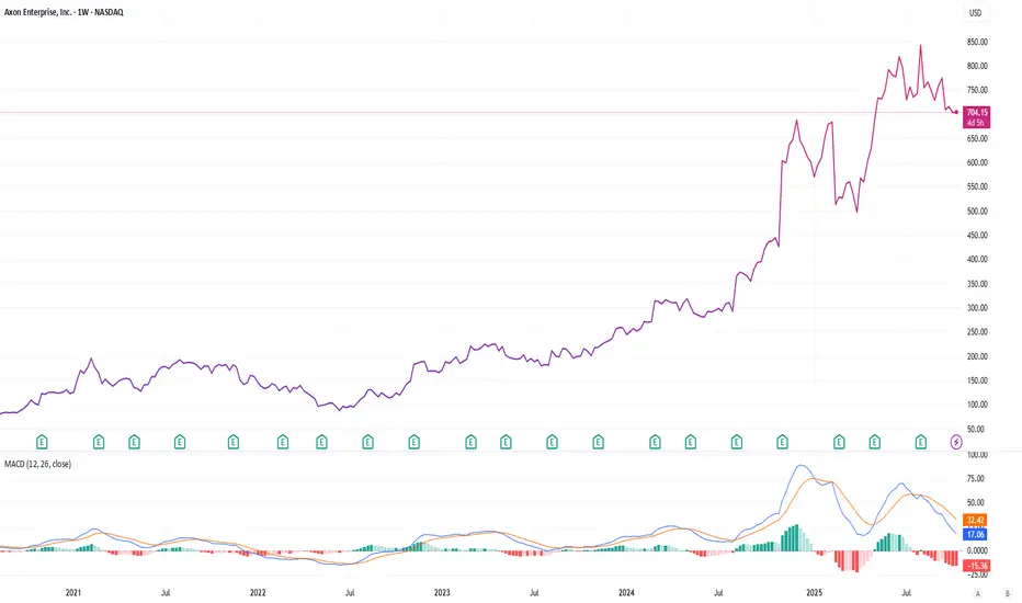Axon has demonstrated robust growth, with 2024 revenue reaching $2.1 billion, a 33% year-over-year increase, marking its third consecutive year of 30%+ growth. Software and services revenue hit $806 million (44% of total), while annual recurring revenue (ARR) grew 37% to $1.18 billion by mid-2025. Net income for 2024 was $377 million, with diluted EPS at $4.8. Q2 2025 revenue rose 33% to $669 million, with software contributing $292 million (40%). The stock, trading at $712 as of October 13, 2025 (per the finance card above), has surged 7.5x since a 2022 low, reflecting a market cap of ~$60 billion. The company projects 2025 revenue of $2.55–2.65 billion and Adjusted EBITDA of $640–670 million, supported by $2.2 billion in cash and investments.