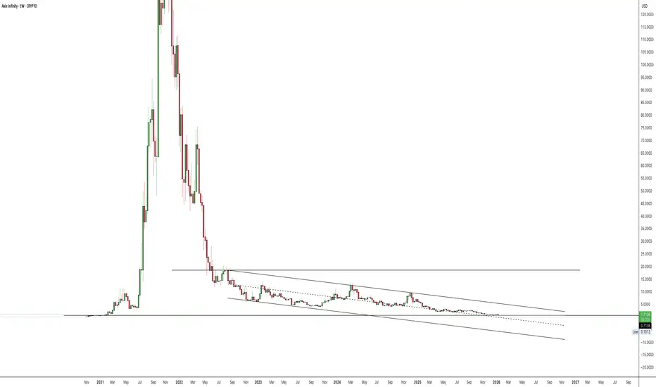 Since the 2021 vertical blow-off, price has bled inside a clean falling channel, volatility crushed and volume dying out. Each rally has been weaker, but the compression at the bottom of the channel now looks more like quiet accumulation than fresh distribution.