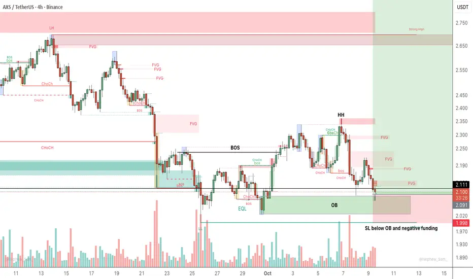 Price traded into OB so trying a leverage long on AXS as fits setup. The RR down here is good and if get a good reaction will let this one run. Negative funding on it also so people are heavily shorting down here which seems a bad idea.
