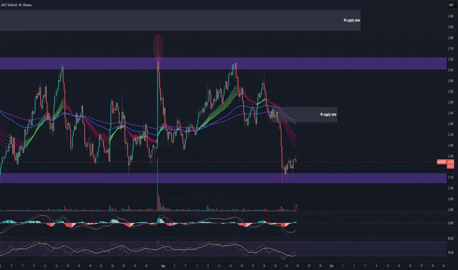 Price previously moved up after retesting the support at $2.15. MACD is showing bullish momentum, RSI is sold and EMAs are bearish. Mixed indications overall, but price needs to breaks and close above $2.25 in order to expect further bullish development aiming towards the 4h supply zone around $2.41 as a midterm target.