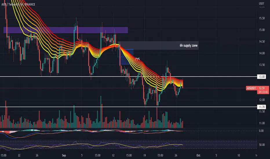 Price is currently consolidating between the support at $11.7 and the resistance at $13. MACD is not clear, RSI and EMAs are neutral. I am expecting price to move up towards the 6h supply around $14.2 before moving down again.