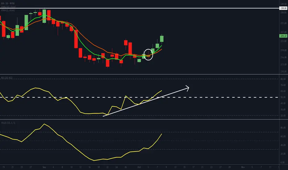 - BA's EMAs have crossed bullishly and are developing angle and separation.