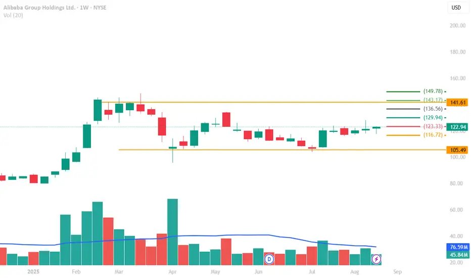 Structure / Pattern: Price remains in a horizontal range between $105 (support) and $141 (resistance). The recent higher low near $116.7 suggests buyers are defending dips.