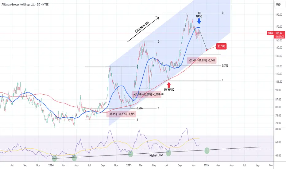 Alibaba (BABA) has been trading within a Channel Up since the October 07 2024 High. Right now it is on the 3rd Bearish Leg of this pattern, confirmed below the 1D MA50 (blue trend-line).