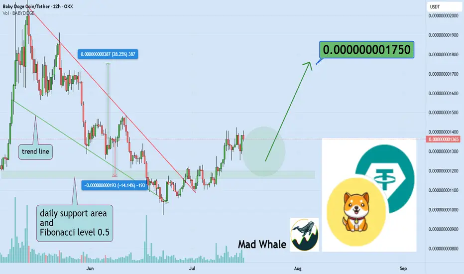 BABYDOGEUSDT has successfully broken above its daily trendline and key resistance zones, signaling a potential shift in momentum. With this breakout confirmed, I'm eyeing the 0.00000000175 level as a short-term target, which implies around 28% upside from the current price. As long as price holds above the breakout zone and no bearish divergence appears, the setup remains valid. 📈🐶