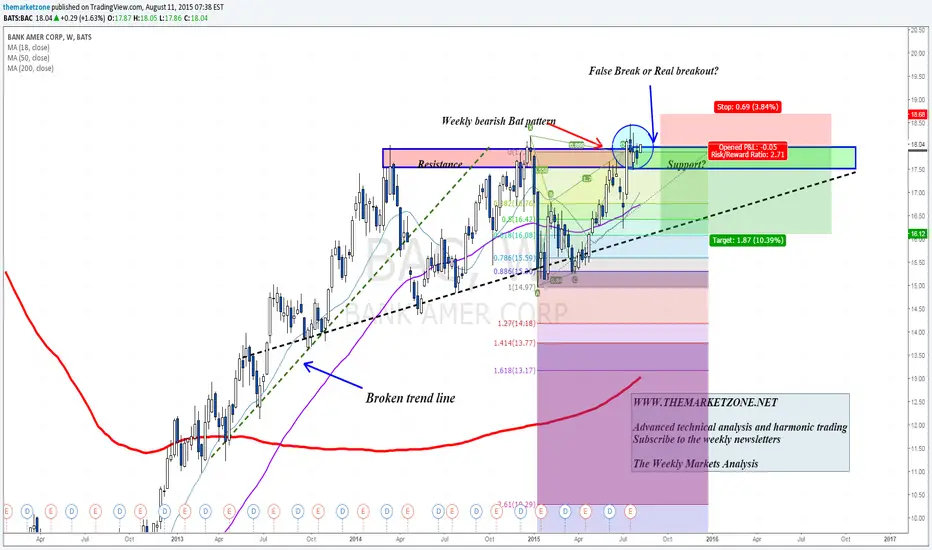 BAC has completed a weekly bearish Bat pattern (PRZ between 17.8$ and 18.3$ that managed to stop, for a while, the stock's rally.