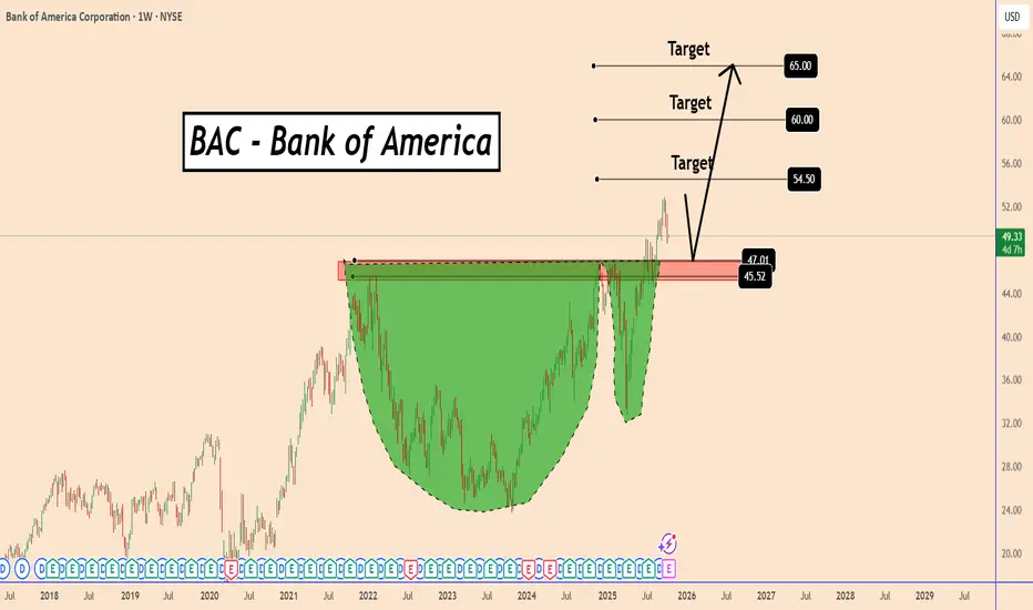 As long as the BAC price stays above this area, the trend remains bullish, with potential upside targets near $54.50, $60, and $65.