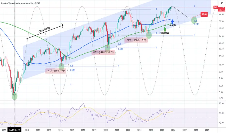 Based on that, Bank of American is entering into peak territory. Whether that lasts for longer (like 2014 - 2016 an 2018 - 2020) or shorter (2022), the common parameter has been the 1M MA100 (green trend-line), marginally below which the last two corrections took place.