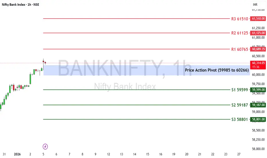 If Bank Nifty sustains above the Price Action Pivot Zone (59,985–60,266), the index may move toward R1 at 60,765.