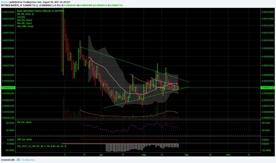 I really like this project and in my opinion BAT with Brendan Eich (creator of java script and co funder of mozilla firefox) and others has one of the best teams out there. I dont think BAT is good for quick gains though it's definitely worth watching and is good for a medium or longer term trade. The merging triangle suggests that there is gonna be decision soon. I see the odds to the upside and I am long from 4900 quite some time already