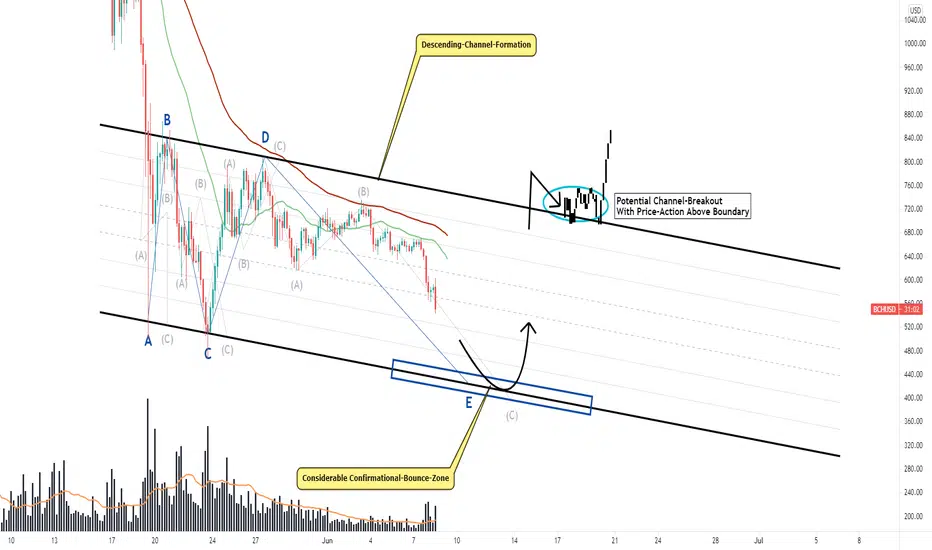 Welcome to this analysis about Bitcoin Cash, we are looking at the 4-hour timeframe perspectives. Bitcoin Cash has moved into an interesting constellation as it developed this main descending-channel-formation in the structure with the coherent wave-count within and the waves A to D almost already completed. Now Bitcoin Cash is moving forward with the protracted wave E that will complete the whole wave-count and when Bitcoin Cash manages to bounce within the confirmational-bounce-cluster marked in blue this can be the possible origin for a channel-breakout to the upside, therefore it is highly necessary that Bitcoin Cash rightly manages to bounce and show up with further bullishness to the upside, otherwise when falling below the lower boundary the bullish scenario can also invalidate, it will be an important development ahead.