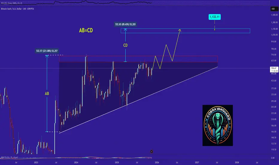 If this pattern breaks to the upside, there’s hope that the AB leg will equal the CD leg, potentially pushing the price up to around $1100.