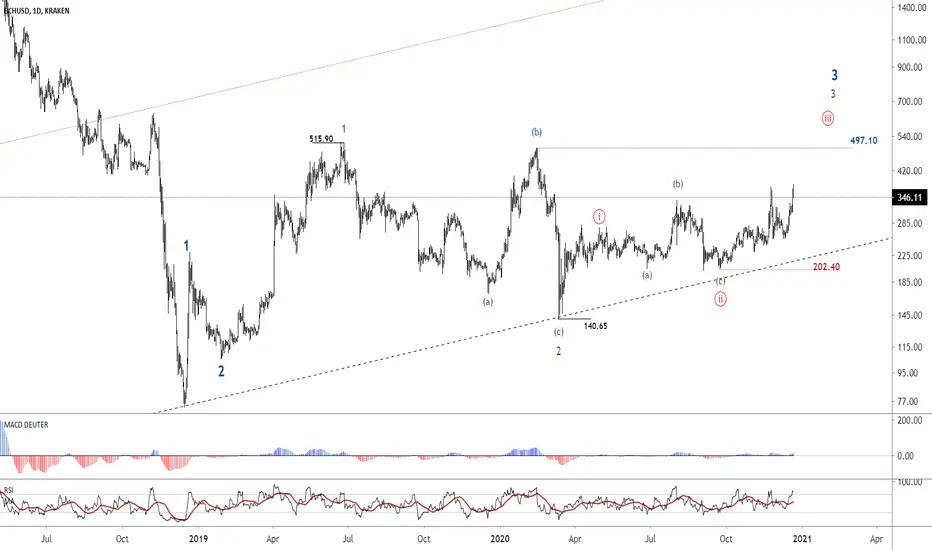 In the daily chart, we can have this wave count that wave 2 has ended in the range of 140.65, and the price is forming wave iii. However, to confirm the uptrend, the price must cross the range of $ 497.10.