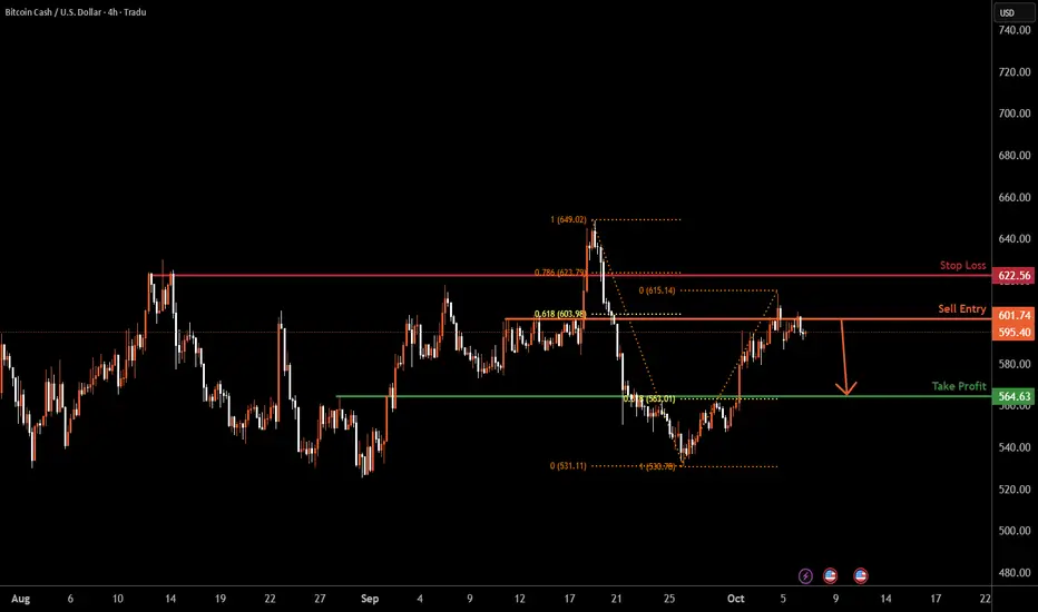 Sell entry is at 601.74, which is a pullback resistance that aligns with the 61.8% Fibonacci retracement.