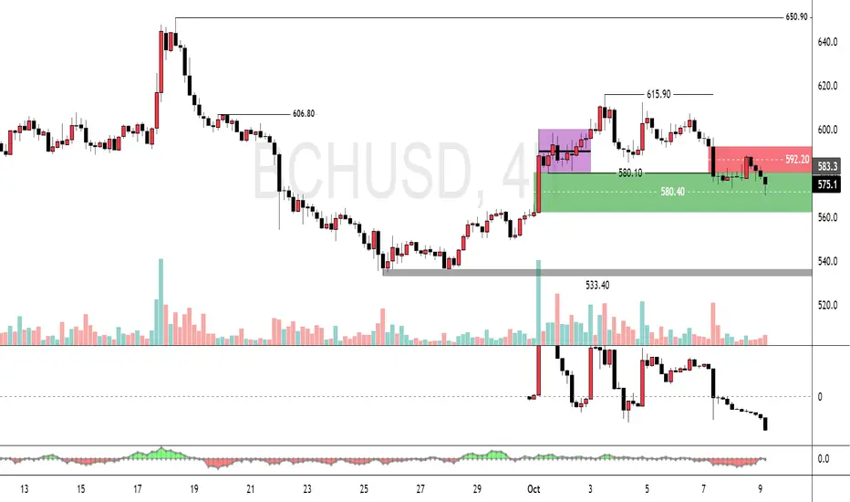FenzoFx—Bitcoin Cash dropped from $615.90, testing the bullish fair value gap as support. The 4-hour chart shows price respecting the bearish FVG mean threshold, while cumulative volume delta declines—signaling bearish pressure.