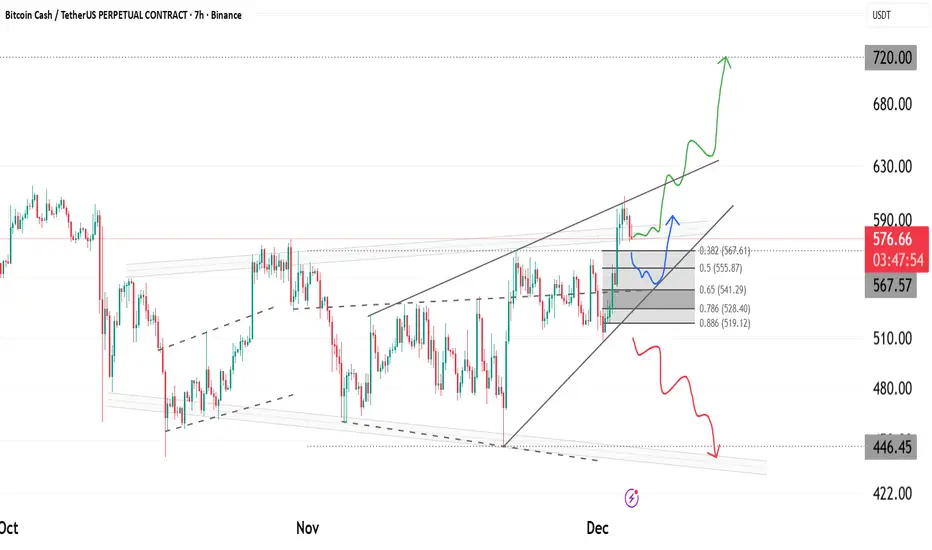 BCH is compressing inside a rising wedge. A breakout means continuation toward 720, while a breakdown exposes 446. Watch the fib cluster for confirmation of direction.