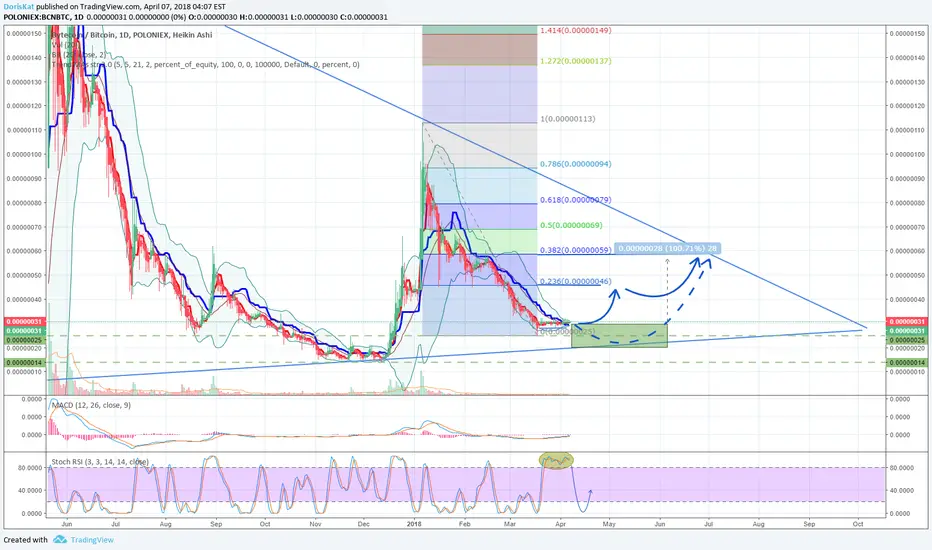 After the beginning of the year, the BCN continued to fall, its price was worth 25 satoshi and is already trading near 30 satoshi for almost a month. Bollinger bands are narrowed, which indicates the possibility of a good pulse. Unfortunately to say exactly when exactly the race will take place we can not.