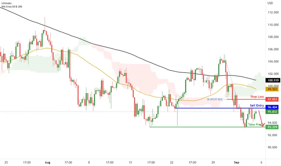 On the H4, with price below ichimoku cloud and MA Cross, we have a bearish bias that the price may pullback to the sell entry at 96.404, where the overlap resistance is, and then drop to the take profit at 93.319, which is in line with the swing lows support. Alternatively, if the price breaks the buy entry, the stop loss could be at 97.853, where the 38.2% fibonacci retracement is.