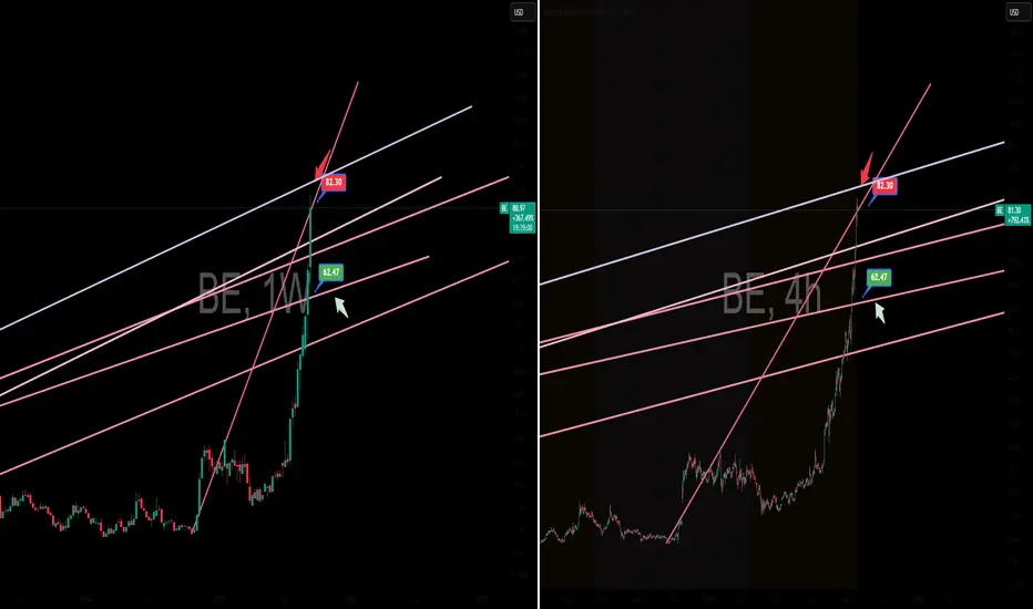he recent price action of BE shows that the stock's rally has met a critical barrier. The price has surged to a major resistance trendline and has been firmly rejected. This rejection is clearly marked by the red arrow on the chart, indicating a high-probability reversal as sellers regain control.