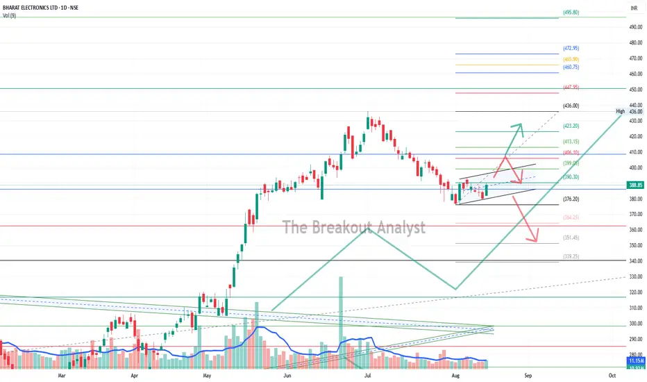 BEL (Bharat Electronics Ltd) is forming a wedge pattern on the daily chart, indicating a possible strong move soon. Price is nearing the apex, where a breakout or breakdown could define the next trend.