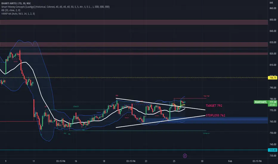 Bharti broke above triangle pattern & comfortably trading above it with good volumes on 30 min TF.