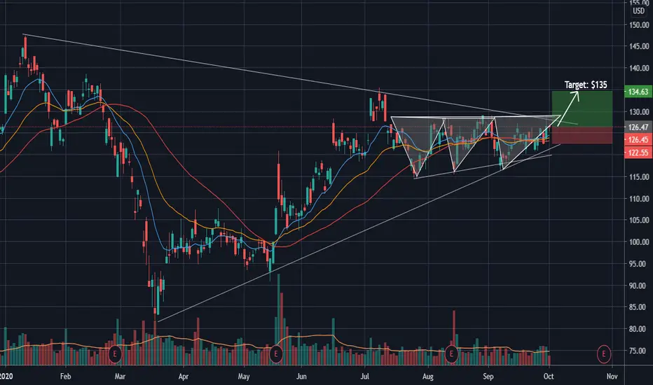 BIDU is reaching the apex of the channel it has been in, while also forming a triple bottom pattern within the channel. I am suspecting a breakout towards the 135 area.
