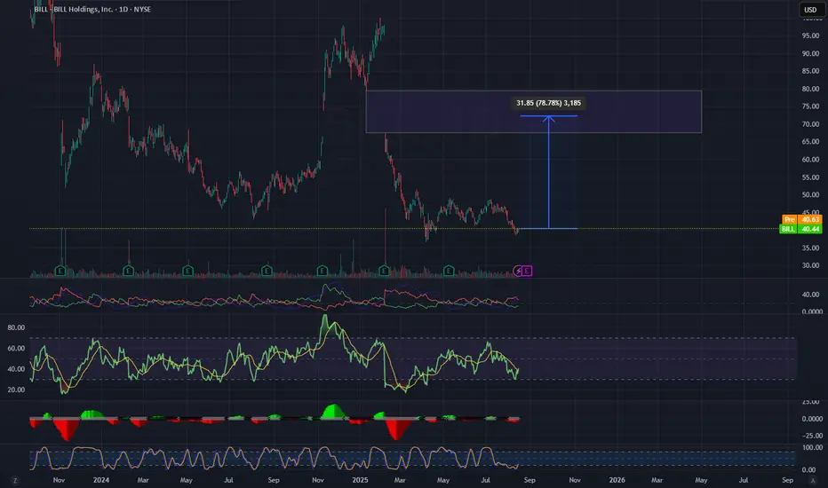 BILL is testing a multi-year support zone around $38–40 after a prolonged decline. Technicals point to bearish exhaustion with a high-probability setup for a reversal. Upside targets include $50 → $62 → $75–80 (gap fill). Breakdown below $35 invalidates the setup.