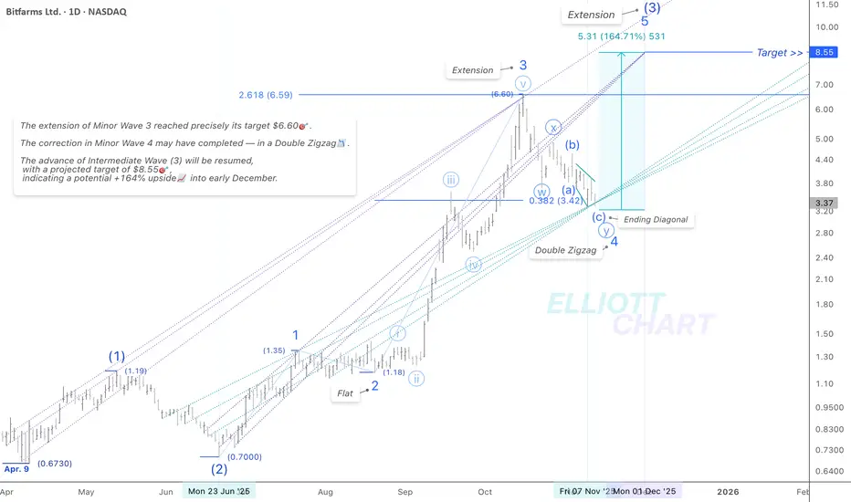 The near-term bullish structure remains intact. In my view, there is sufficient space between the convergent and divergent equivalence lines to project the next advance — with Intermediate Wave (3) anticipated to re-extend through Minor Wave 5, targeting around $8.55🎯, implying an estimated +164%📈 upside into early December.