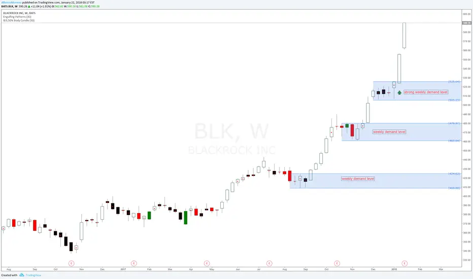Blackrock Inc. clear longer bias with new weekly demand levels being created. Price has not pulled corrected for months hence no retracement to buy setups at weekly demand imbalances created around 526, 481 and 424 price areas respectively. Long term long bias at weekly and monthly demand zones with new demand imbalances being created and respected.