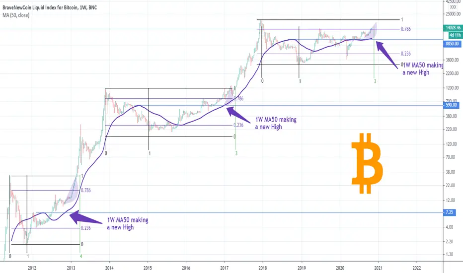 Those are the MA50 making a new High on the 1W time-frame and trading above the 0.786 Fibonacci retracement level. That happened at least back in late 2012 and 2016.
