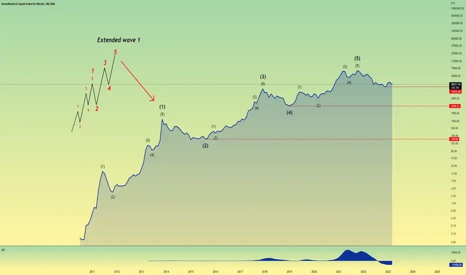 So after going over BTC inception data I've come to the conclusion that this is the correct wave count, I'm of the belief that BTC has already made it's cycle bottom and we're early stages of a new Bull Cycle which will last many years, These 5 waves up all complete a larger degree wave 1 and the correction we've had will be wave 2 of a larger degree (providing the bottom is in) - if this is correct we're in a wave 3 of larger degree.