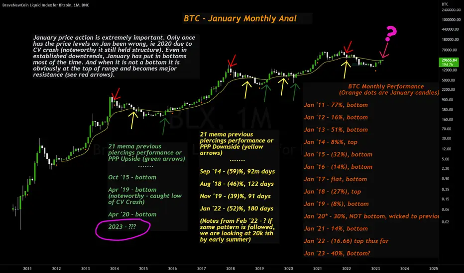 If this monthly can close above the 27k handle, it will signal a very strong position for bulls. If you are unaware of how important January price action is, check out this nifty chart I made. Also listen to the streams we did at the beginning of February to hear some rants about it. The pink arrow is showing the current upside piercing attempt. The green arrows show the previous instances. The tables on the bottom show performance of all piercings, up and down. We are at the cusp of flipping into a bullish regime for crypto. Lets keep that popcorn out and see if they can confirm it on the highest of time frames.