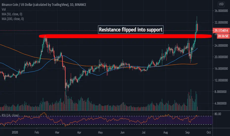 At the time of writing, Binance Coin is seeking support above $30 after hitting a new September high at $34. If the retreat extends below 30, the resistance flipped into support at $28 will come in handy.