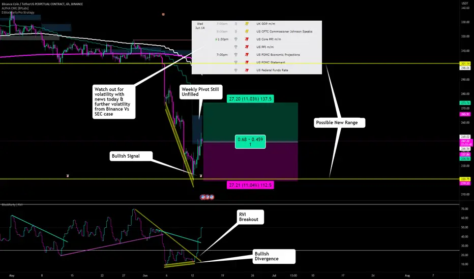 Although our faith is very much with Binance on this one - we have a bullish signal, along with a bullish divergence coming in from an oversold position on the RVI. There is a strong trendline breakout. It is is also looking like it could be setting up a new range between 301.14 and 220.75. Along with the bullish untested Weekly Pivot.