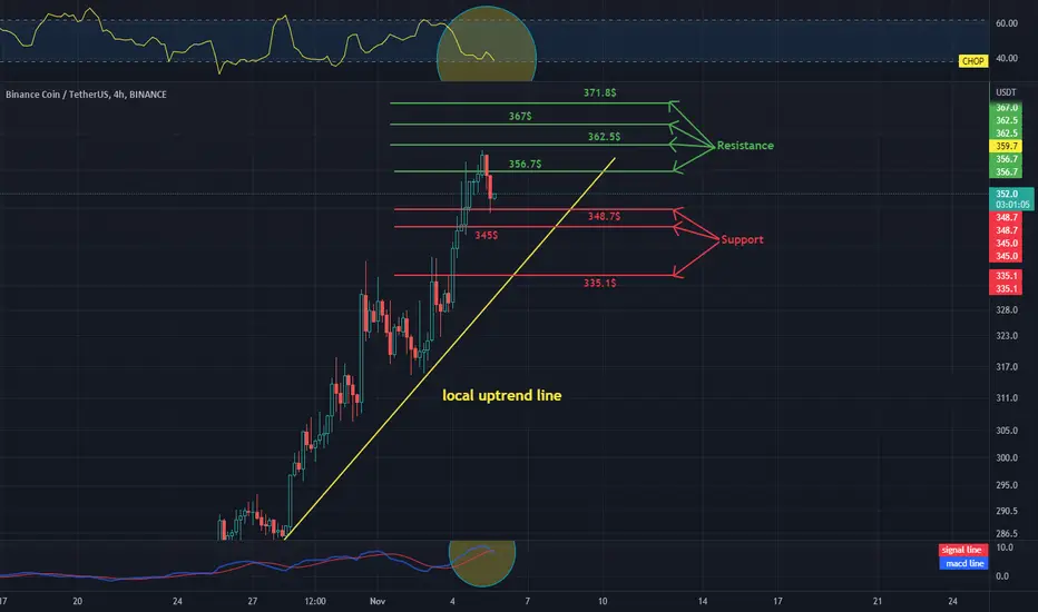 Hello everyone, let's take a look at the BNB to USDT chart over the four hour timeframe. As you can see, the price is moving above the local uptrend line.