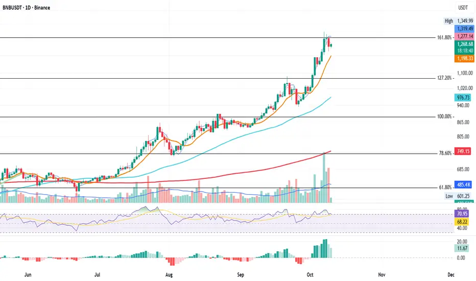 Since July, BNB has delivered an impressive rally. Back then, price was sitting near the 61.8% Fibonacci level, and from there it climbed all the way to a new all-time high at the 161.8% Fib extension, which is now acting as resistance.