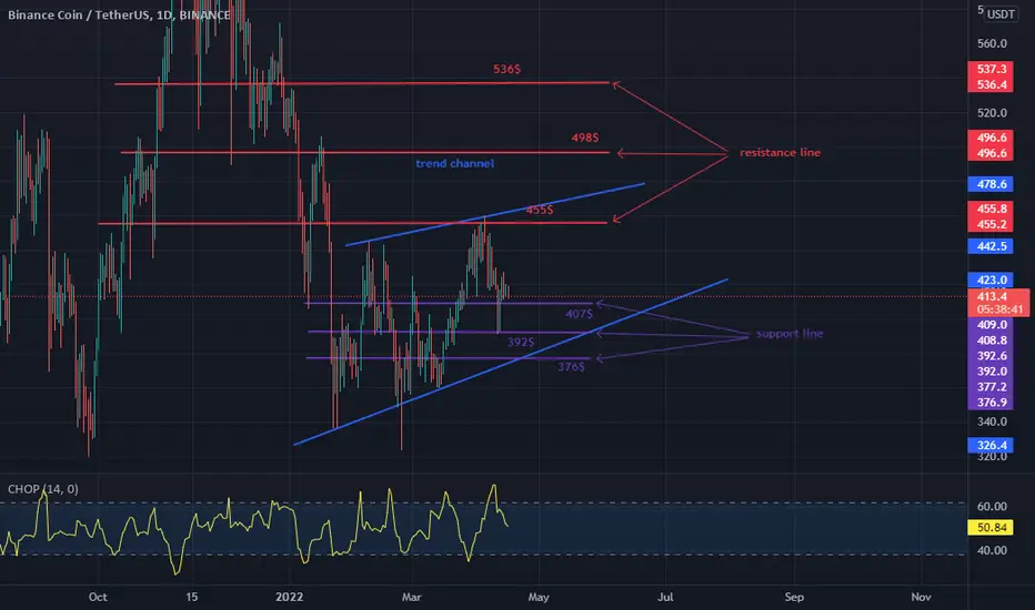 Let's start with the designation of the support line and as you can see the first support at which the BNB price is currently located is $ 407, if the support breaks down, the next is $ 392, and the next is $ 376.