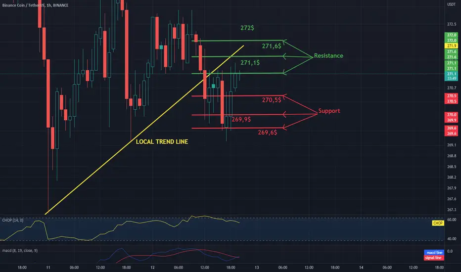 Hello everyone, let's take a look at the BNB to USDT chart over the 1 hour timeframe. As you can see, the price is moving below the local uptrend line.