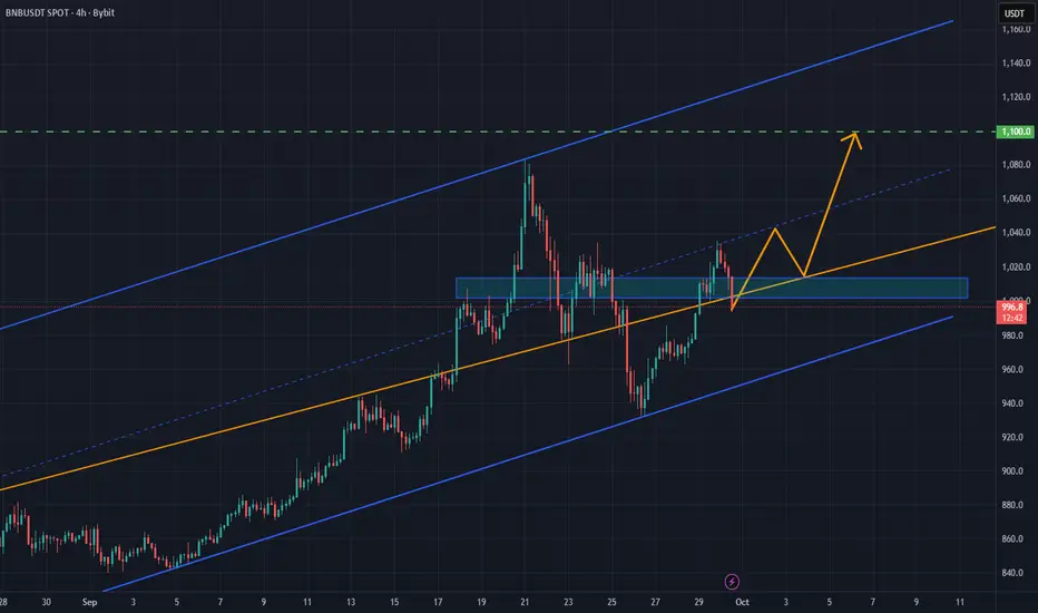 BNB/USDT is trading within a well-defined upward channel following a corrective pullback from its all-time high near 1,080. The recent rebound from a higher low around 1,000 confirms the presence of structural support and sustained bullish momentum.